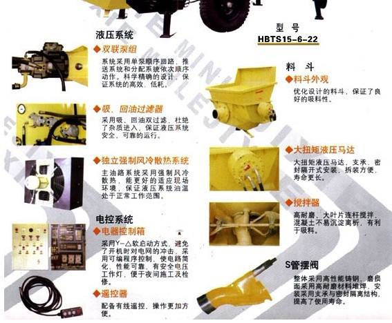 電機 主油泵(現(xiàn)在一般用韓國川崎的進口主油泵) 電磁閥(國內用華德的多) 料缸 主油缸(國內品牌好的是協(xié)力油缸) 潤滑泵 (6路潤滑泵)風冷(冷卻液壓油的,也有廠家用水冷,水冷工地需要接水,就是這個麻煩一些)電控柜 (PLC歐姆龍的比較好點)