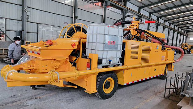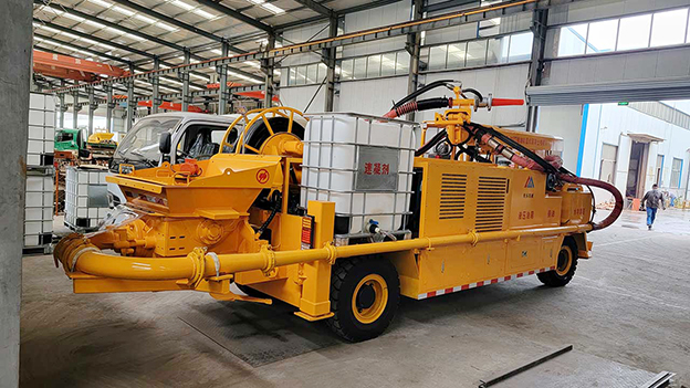 3.車載式濕噴臺(tái)車配有自動(dòng)潤滑系統(tǒng),對(duì)主要密封部位采用自動(dòng)潤滑,油脂加注量、加注時(shí)間自動(dòng)控制,大大延長易損件壽命。速凝劑添加連續(xù)可調(diào),可根據(jù)噴漿量調(diào)節(jié)。